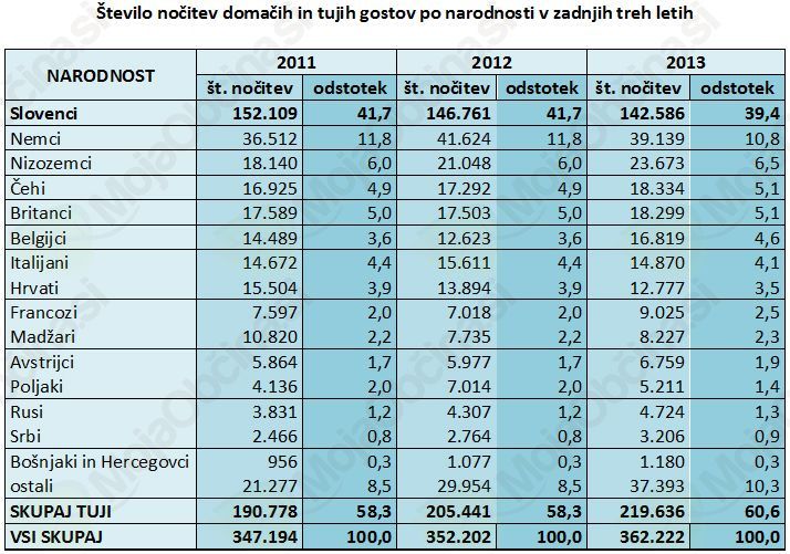 Največje povečanje števila nočitev beležijo pri Belgijcih, kar tretjino več, pri Francozih, Izraelcih, Rusih in Srbih, medtem ko beležijo upad števila nemških in italijanskih gostov. »Nekoliko zaskrbljujoč je zabeležen 13-odstotni upad nemških gostov, ki so po številu med tujimi gosti na prvem mestu. Kar pa je hkrati argument, zakaj bomo morali v prihodnjem letu narediti več aktivnosti na nemškem tržišču. Iz upada števila nemških turistov se vidi tudi, da se takoj pozna, če samo v enem letu zmanjšaš število promocijskih aktivnosti v eni državi,« je pojasnil Langus. Na tretjem mestu po številu nočitev so nizozemski gostje, katerih je Bohinj letos obiskalo za 13-odstotkov več kot lani, sledijo jim Britanci in Čehi.