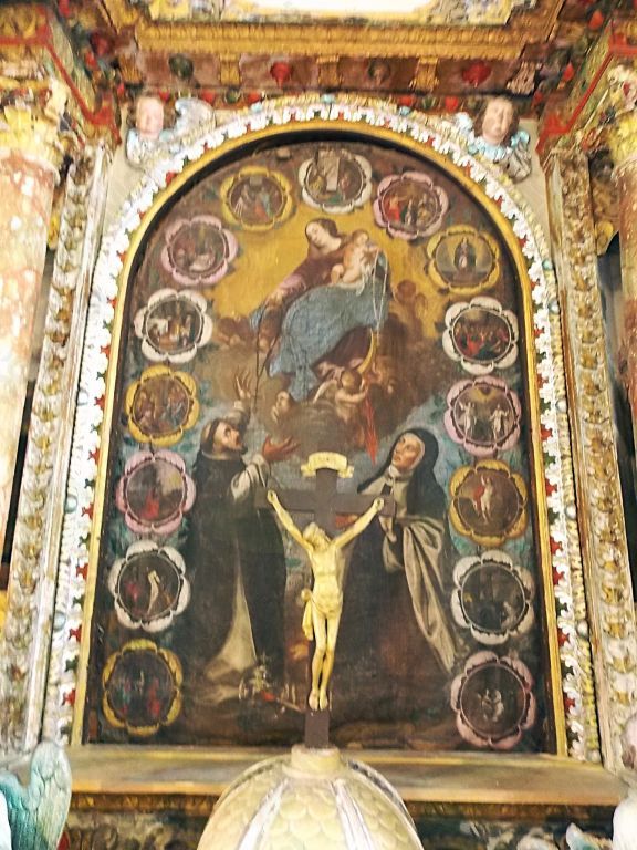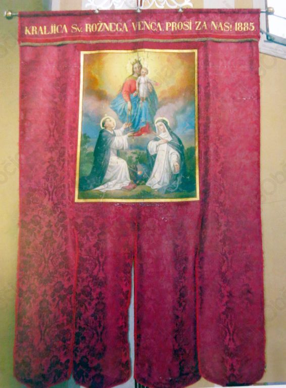 Najpomembnejši dokaz je prav gotovo v glavnem oltarju nameščena tabla s podobo Marije, ki v rokah drži rožni venec, ki jo lahko nadomesti kip sedeče Marije z Jezusom. Na banderu iz leta 1885 je prikazana upodobitev sv. Dominika (začetnika molitve sv. rožnega venca), ki od Marije sprejema rožni venec, ter sv. Klare. Oba že našteta svetnika najdemo tudi v glavnem oltarju, enega na Marijini levi, drugega na njeni desni strani.
