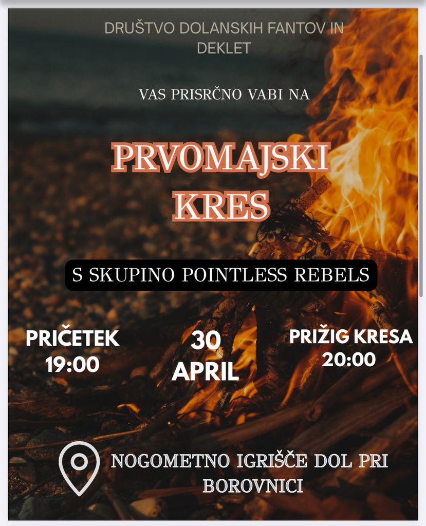 Društvo dolanskih fantov in deklet vas prisrčno vabi na tradicionalno prvomajsko kresovanje s skupino Pointless Rebels!