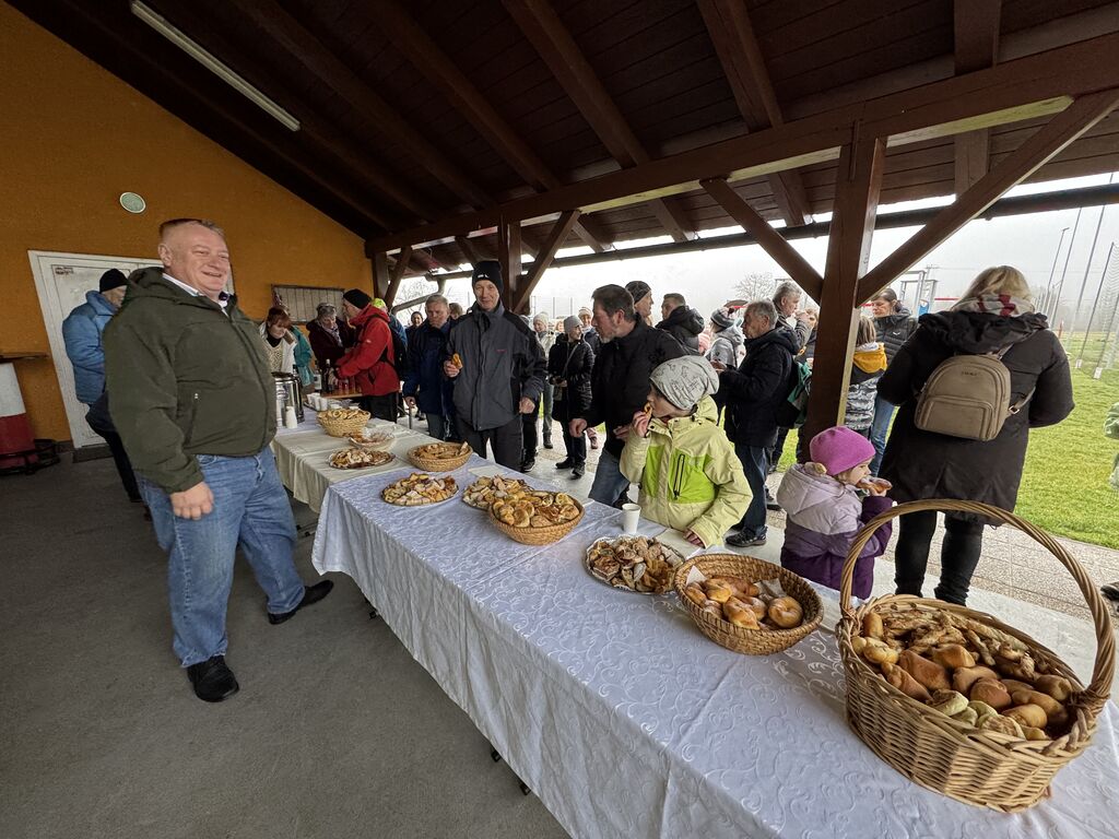 Na polovici pohoda je prav prišlo okrepčilo, slastne dobrote, kuhano vino in čaj so pripravile pridne članice Društva podeželskih žena Ajda in vse skupaj postregle pod zavetjem prostorov na nogometnem igrišču na Dolu, kjer deluje Društvo dolanskih fantov in deklet. Predsednik Boštjan Zakrajšek je izrekel dobrodošlico in predstavil kratko zgodovino in delovanje društva, katerega namen je druženje in organiziranje različnih aktivnosti. Kot zanimivost je povedal, da imajo tudi sekcijo sprehajalcev psov.