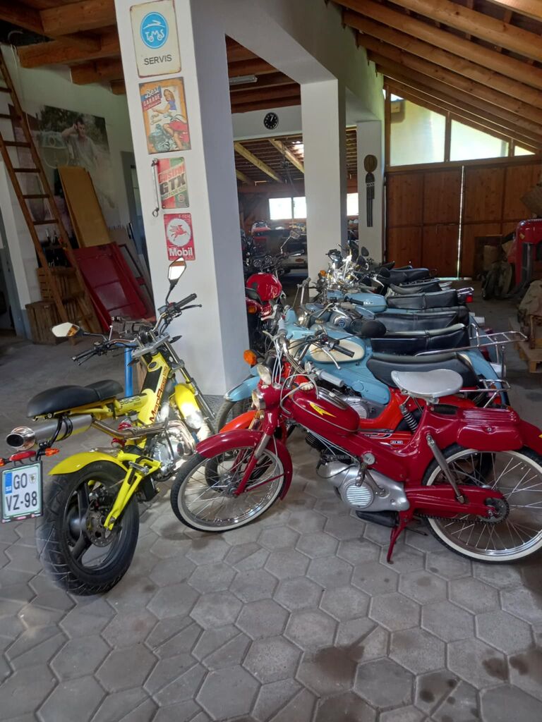 Pogled na zbirko motorjev je kar lep, teh je več kot 15, najstarejši je rdeč avstrijski, letnik 1957, za katerega ima tudi dokumente. Prevladujejo Tomos in Puch motorji, posebej ljub mu je očetov motor, od njega ima sicer tudi še kolo, ki ga je očetova mama kupila tako, da je prodala kravo. Z zbirateljstvom motorjev je začel, ko je zbolel in je moral prodati konje. “Ko ne moreš več dati komata na konja in ko ni več moči, je hudo in takrat moraš preusmeriti misli drugam. Pa sem začel z zbirateljstvom, obnovo ...” Stare motorje je pridobil tudi s pomočjo oglasov v Kmečkem glasu, ko so se oglasili kmetje, ki so imeli kaj za prodati. “Sedaj je pa tudi mularija navalila na te stare motorje,” pripoveduje v pogovoru.