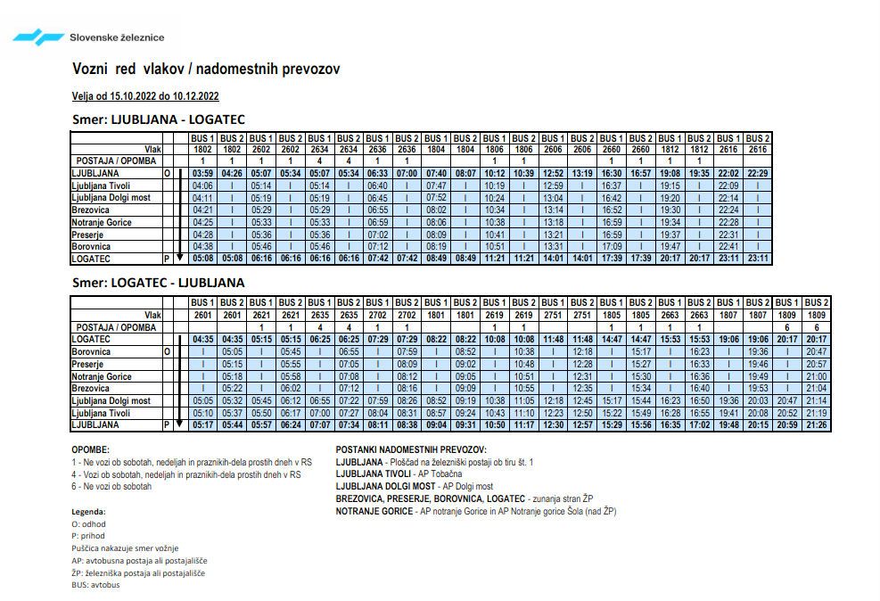 SŽ d.o.o. so sicer za obdobje med 15. 10. in 12. 12. 2022 na svoji spletni strani že objavile seznam nadomestnih prevozov na relaciji Logatec–Ljubljana in obratno, vendar na Občini Borovnica menimo, da bi morale biti o tem pravočasno in neposredno obveščene tudi občinske uprave in občani v občinah ob progi in pričakujemo, da bo temu tako že ob naslednji spremembi voznega reda oz. nadomeščanju prevozov z vlaki s prevozi z avtobusi.