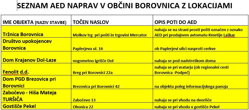Občina Borovnica je iz lastnih sredstev kupila še dva defibrilatorja (AED) – napravi za pomoč pri oživljanju v primeru srčne kapi. En je nameščena pri vhodu v gostišče Pekel, druga pa pri vhodu do AMT24 d.o.o. najem in prodaja rabljenih vozi v Zabočevem. V prilogi spodaj si lahko ogledate seznam vseh lokaciji defibrilatorjev AED v naši občini. Obe napravi sta vneseni tudi v mrežo o ozaveščanju javnosti o AED, ki jo vodijo študenti Medicinske fakultete Univerze v Ljubljani, kjer lahko najdete tudi navodila za uporabo naprav AED. (ob)