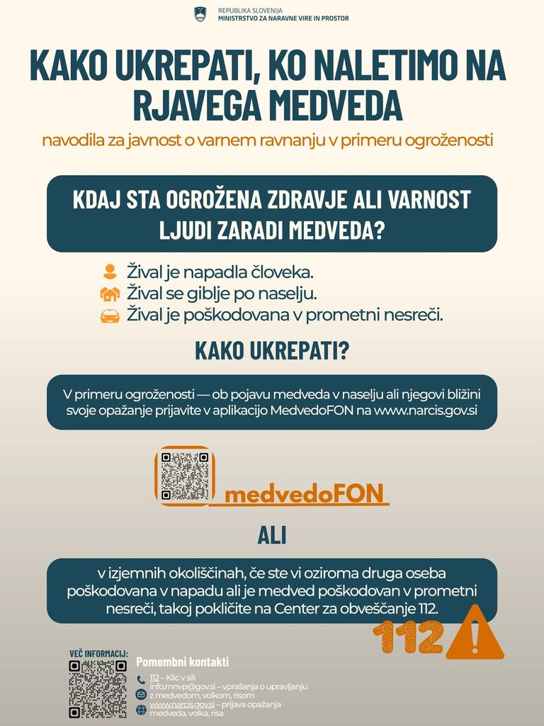 Rjavi medved se običajno umakne človeku, a včasih zaide v naselje, na vrt ali dvorišče. V primerih, ko velika zver pomeni neposredno nevarnost za ljudi ali premoženje, uporabite MedvedoFON. Gre za novo orodje sistema NarcIS, ki združuje biodiverzitetne, naravovarstvene in prostorske podatke.