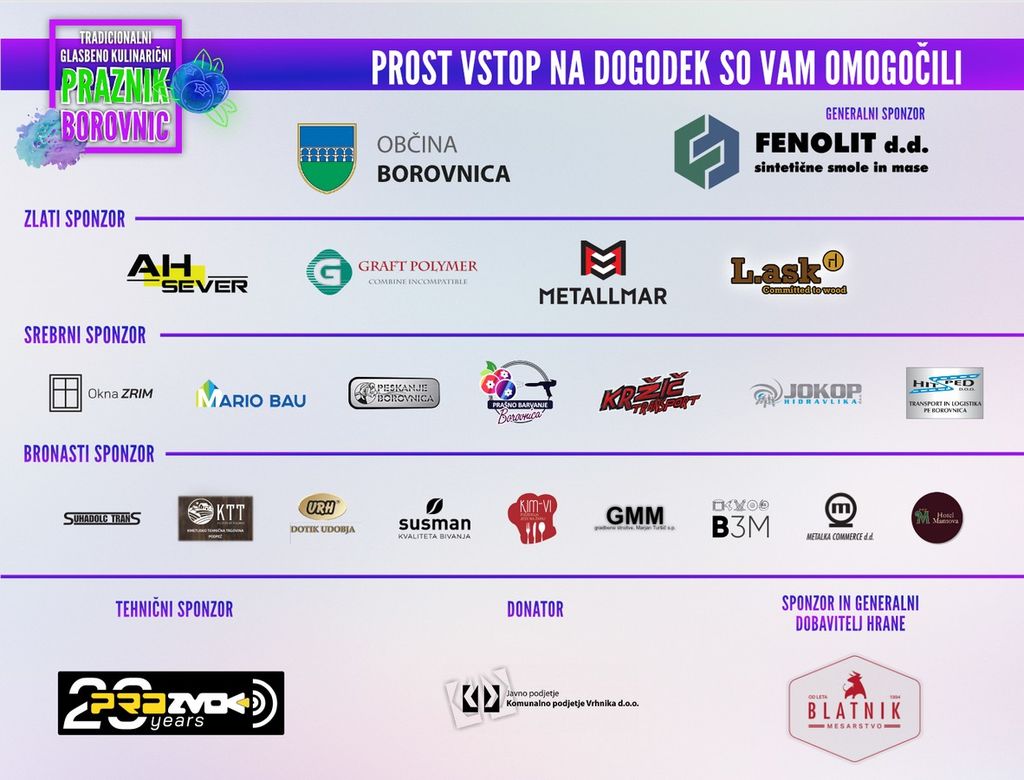 Prost vstop so omogočili: Občina Borovnica, kot nosilec projekta, organizator in tehnični sponzor Prozvok d.o.o., glavni sponzor Fenolit d.d. in lokalna podjetja, ki se jim še posebej zahvaljujejo, saj brez njihove pomoči ne bi mogli speljati dveh prizorišč.