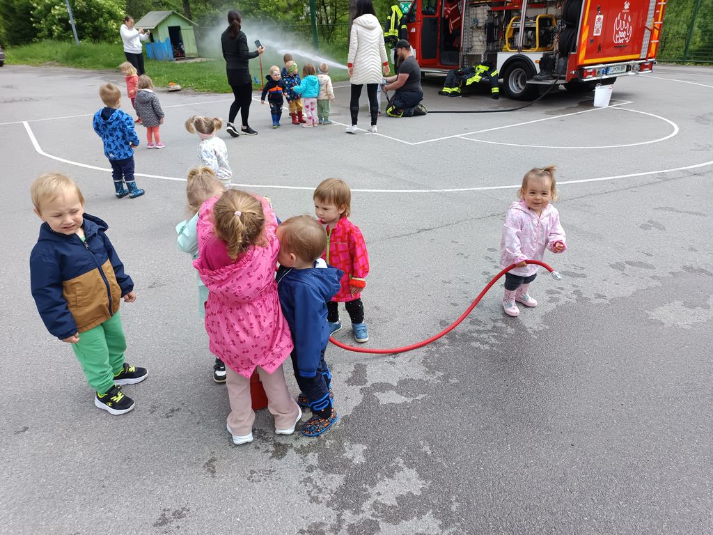 škropili tudi s pravo gasilsko brizgalno. Otroci so se seznanili tudi z