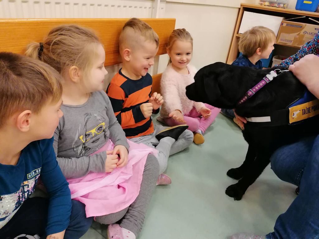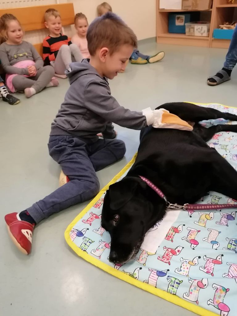 Res smo naslednje jutro po zajtrku dobili obisk. Ga. Sabina Miklavčič, naša pedagoška vodja, je v naš oddelek privedla svojo psičko Lady in z nami preživela prijetno in poučno urico. Otroci so izvedeli, kako pes dobi naziv TERAPEVTSKI PES in kako se morata skupaj z vodnikom psa šolati, da pridobita potrebno znanje. Otroci so spoznali, kako je treba vsakodnevno skrbeti za psa, kako ga negovati, ga hraniti, se mu približevati … S pomočjo vrečke presenečenj so otroci spoznali različne pripomočke, ki jih terapevtski pes potrebuje. Vsak izmed otrok je aktivno sodeloval pri hranjenju, negovanju in vodenju psičke na povodcu. Naučili smo se tudi, kako je treba pobirati pasje iztrebke in kako ravnati, če zunaj srečamo tujega psa.