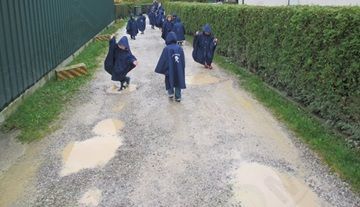 Kaj je lepšega kot to, da smo lahko brez večnega »Ne, ne smete skakati po lužah!« skakali po lužah in v tem neizmerno uživali ... Sicer tisti dan ni deževalo, ampak nam je bilo tudi brez dežja v dežnih plaščih in škornjih zelo lepo.