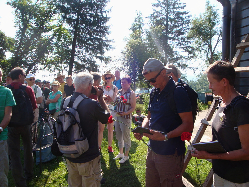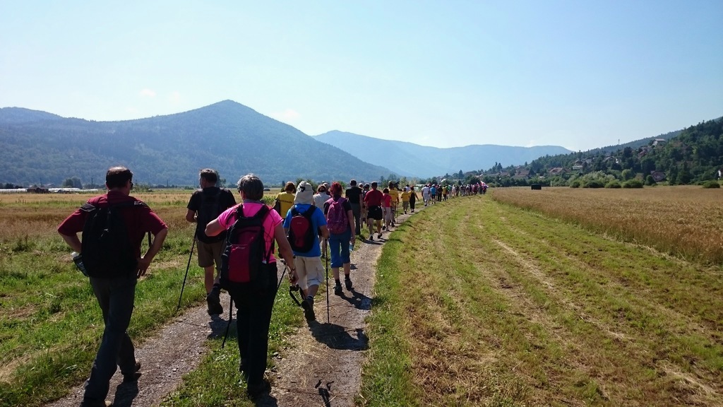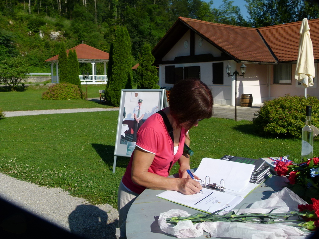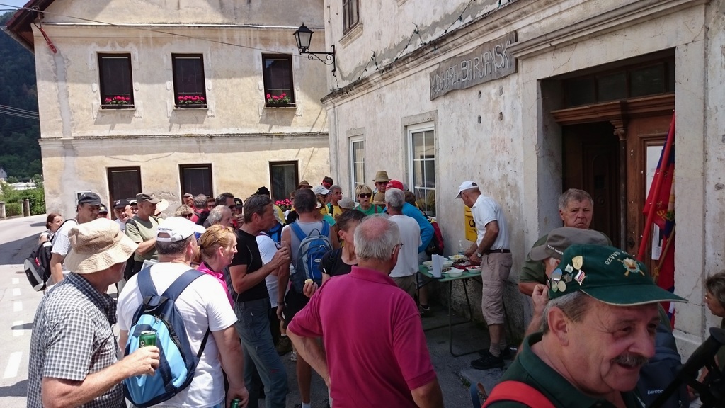 Kar 81 pohodnikov se je zjutraj zbralo na vrtu gostišča pred TMS v Bistri in druščina je bila pisana, tako po spolu kot po starosti in razpoložena. Prišli so Tonetovi svojci, sosedje in prijatelji, prišli so veterani naši člani, številčni so bili zopet veterani iz Sevnice in Kočevja, najštevilčnejši pa so bili tokrat veterani iz Grosuplja. Presenetila pa je delegacija štirih veteranov iz hrvaškega Ozalja, ki so ta obisk obljubili našim pohodnikom, ko so se letos spomladi srečali na pohodu belokranjskih veteranov. Med vpisom v pohodno knjigo so si udeleženci lahko postregli s kavo in vrhniškimi keksi, pa tudi domača kačja slina ni manjkala. Ker je bil napovedan vroč dan, smo pohodnike opremili tudi z dovolj plastenk vode.