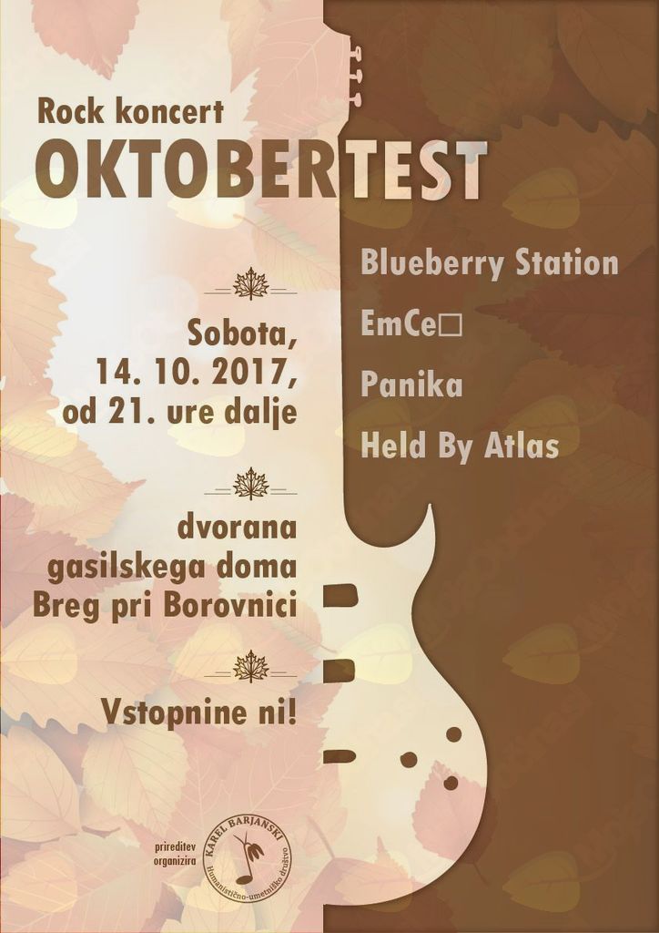 To soboto, 14. oktobra, vabljeni od 21. ure dalje v dvorano gasilskega doma Breg pri Borovnici, kjer bo potekal rock koncert Oktoberfest. Nastopili bodo Blueberry Station, EmCe, Panika, Held by Atlas. Vstopnine ni!