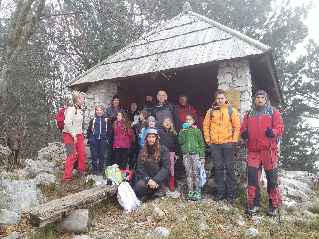 Najprej smo se kar strmo vzpeli do cerkve svete Marije, kmalu za tem smo se razporedili v dve skupini. Hitrejši in malo starejši so pohiteli naprej, v »mlajši« skupini pa smo se prilagajali predvsem najmlajšim, ki so kljub megli in slabi vidljivosti pogumno grizli v breg. Na vrhu smo se ponovno sestali in naredili skupinsko fotografijo. V dolino se zaradi megle ni videlo, prva skupina se je tudi že dodobra namrazila, ko je čakala drugo. Zato so pohiteli naprej in še malo naokrog. Tudi mi se nismo dolgo zadrževali na vrhu. Hitro smo pomalicali, pobrali nekaj smeti, ki so jih pustili naši predhodniki in se po krožni poti odpravili proti dolini. Na slikoviti Napoleonovi cesti nam je skozi oblake veselo posvetilo sonce, kar je precej dvignilo naše razpoloženje. Malo smo počili pri kapelici svete Lucije, kjer si lahko z zdravilno vodo, ki je v majhni skalnati kotanjici, tudi umijete oči.