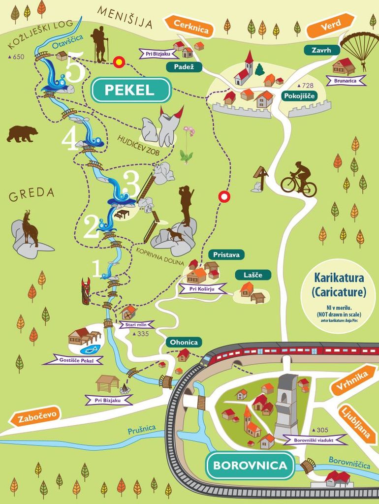 Skozi Pekel teče potok, ki izvira na Bloško-rakitniški planoti, ob njej pa je speljana zavarovana pot, ki jo skrbno oskrbuje Turistično društvo Borovnica. Takšno ime je soteska verjetno dobila prav zaradi bučanja vode ob dolgotrajnih deževjih, kar je včasih ljudi strašilo. Tudi steze so bile težje prehodne in s tem nevarne. Pekel slovi po petih slapovih, ki pozimi zaledenijo in so primerni za plezanje.