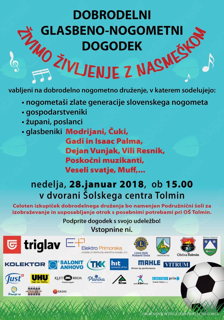 Vabimo vas torej na GLASBENO-NOGOMETNI DOGODEK, v nedeljo, 28. januarja, ob 15.00, v dvorani Šolskega centra Tolmin v Tolminu.