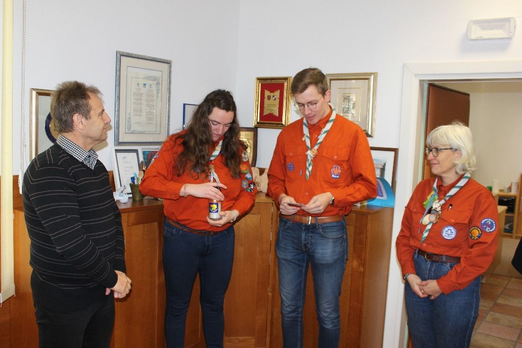 Župana Občine Bovec Valterja Mlekuža so letos obiskali vodja Stega Bovec 1 Tina Kurinčič, Martin Kavčič in vodja Bratovščine odraslih katoliških skavtinj in skavtov Bovec Nataša Bartol. Martin je najprej prebral letošnjo poslanico, ki se glasi: