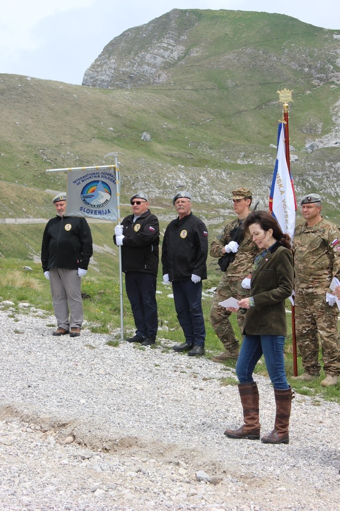 »Bili so najboljši športniki in elitni vojaki. Kako veliko je bilo njihovo hrepenenje po miru in športnem udejstvovanju, da so našli to snežno zaplato na melišču tam pod vrhom Mangarta in izvedli zahtevno smučarsko tekmo. Kako močno sporočilo so nam pustili, pa čeprav zagotovo nihče izmed njih ni mogel niti slutiti, da bomo 77 let potem stali na tem mestu in jim izražali vse časti. Zanje in zase smo zato dolžni ohranjati spomin na tisti 3. junij 1945. S tem pa negujemo tudi trajno slovensko ameriško prijateljstvo in sodelovanje,« so besede, s katerimi je Štulc povabil k besedi veleposlanico Združenih držav Amerike v Sloveniji, njeno ekscelenco Jamie L. Harpootlian.