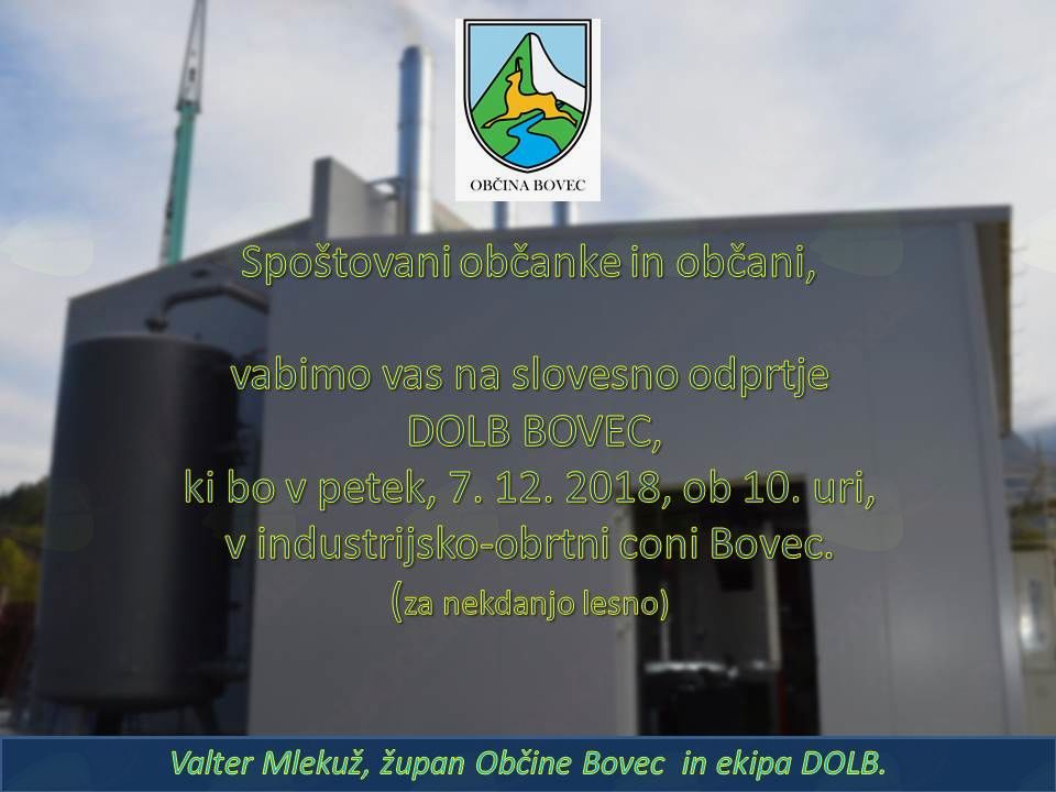 vljudno vas vabimo, da se udeležite slovesnega odprtja sistema daljinskega ogreavnje na lesno biomaso, ki bo v petek, 7. 12. 2018, ob 10.00, v industrijsko-obrtni coni Bovec (za nekdanjo lesno).