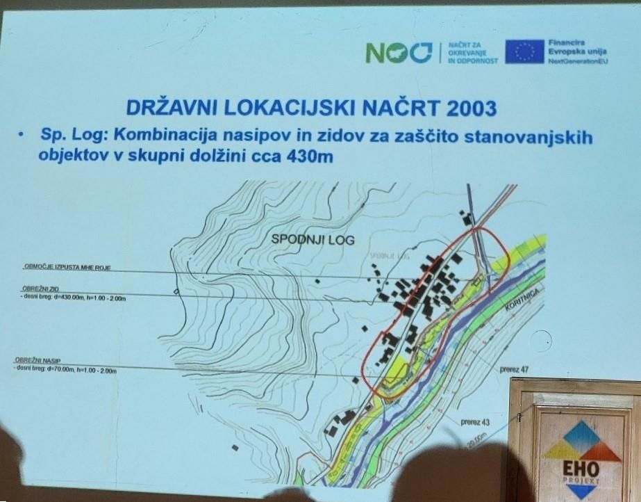 Gradnjo varovalnih objektov v Zgornjem in Spodnjem Logu je predstavil Žiga Jeriha, u.d.i.v.k.i. iz družbe EHO Projekt d. o. o., pri čemer je izpostavil strokovne podlage oziroma modelni izračun in preveritev poteka in višin zidov pred drobirskim tokom novelacijo študije IZVO-R iz aprila 2022 in novelacijo iz leta 2024. V Državnem lokacijskem načrtu je v Zgornjem Logu predvidena kombinacija nasipov in zidov za zaščito stanovanjskih objektov v dolžini okoli 450 m, v Spodnjem Logu pa v dolžini okoli 430 m.