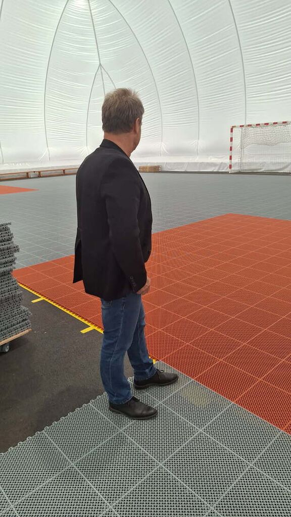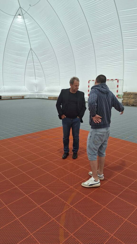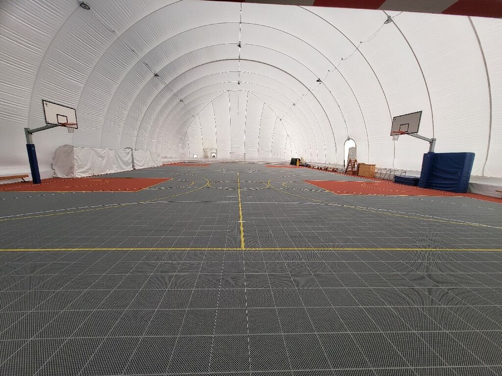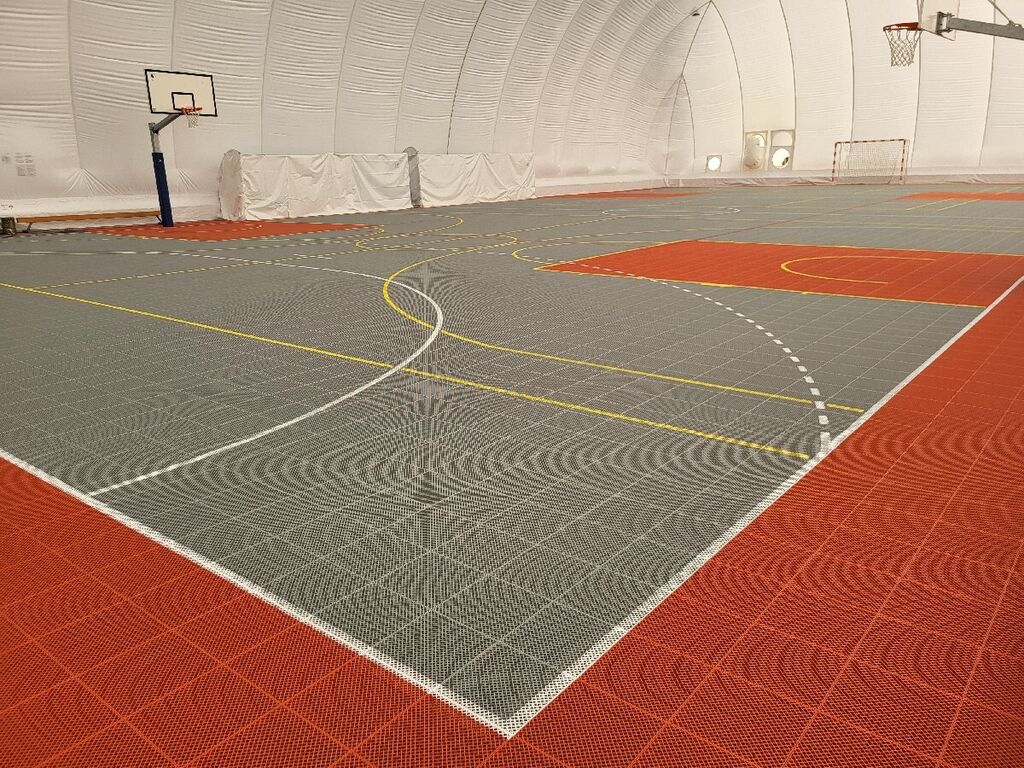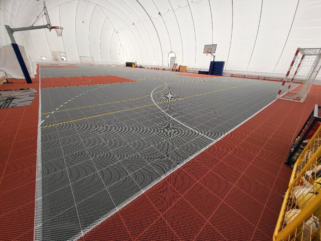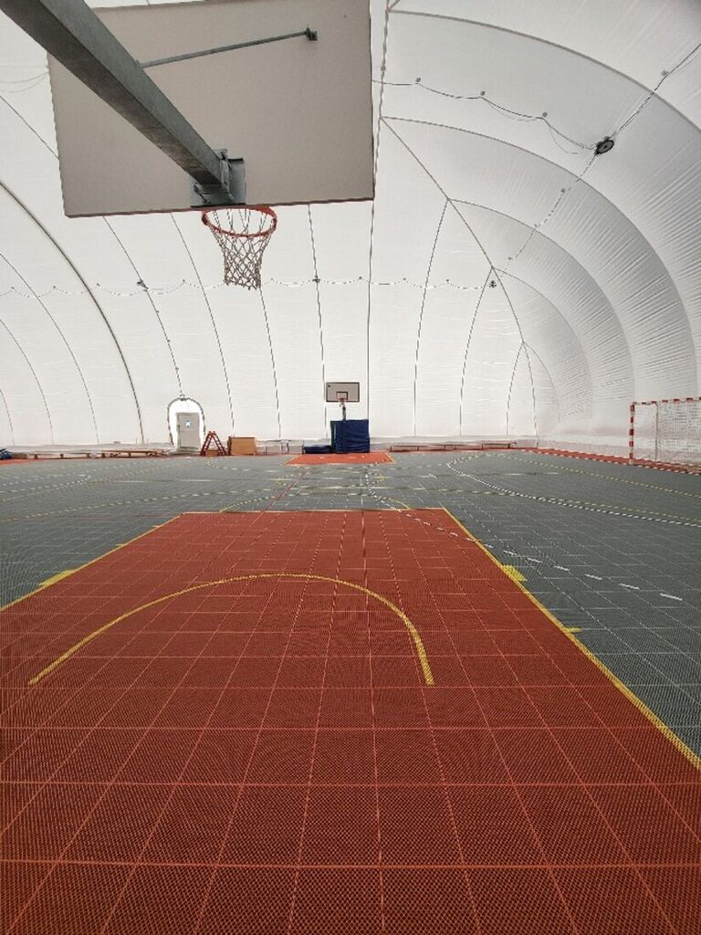 Prejšnji teden je bila po naročili Občine Bovec v balonu, ki služi kot začasni nadomestek športne dvorane, nameščena udobna športna podlaga v izmeri 1.010 m². Novo podlago je dobavil in postavil Wisdom, d. o. o., iz Ljubljane, razpisana pa je bila športna nedrseča podlaga, iz okolju prijaznega polipropilena, ki ga je mogoče reciklirati. Podlaga ima UV zaščito, položena je na geotekstil, zarisi igrišč pa so v dogovoru z naročnikom izvedeni v ravnih linijah z dodatnimi pasovi enakega materiala in v dogovorjeni barvi črt v širini 5 cm. Polkrogi so barvani na plošče. Trenutno so črte prilagojene potrebam v balonu, vendar so začasne, saj bo po zaključku gradnje športne dvorane podlaga demontirana in prenesena na zunanje športno igrišče, tam pa bodo črte na novo narisane v skladu s potrebami na zunanjem športnem igrišču. Za celotno izvedbo je Občina Bovec namenila nekaj več kot 39.000,00( brez DDV), investicija pa je še bolj upravičena, ker bo podlaga še dolgo služila na zunanjem športnem igrišču nad športno dvorano.