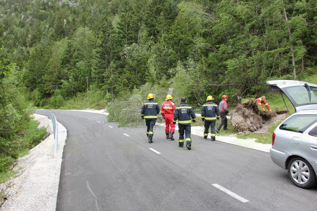 Tako so v petek 16.5.2014 morali bovški in trentarski gasilci kar trikrat posredovati v dopoldanskem času na območju Občine Bovec. Na prvo skupno intervencijo so odšli najprej ob 8.18, ko so jih iz ReCO Nova Gorica obvestili, da je v Trenti, občina Bovec, na električni daljnovod padlo drevo, zaradi česar je zagorela podrast pod daljnovodom. Gasilci PGD Bovec-enota Trenta so požar na površini 200 kvadratnih metrov pogasili in pomagali delavcem Elektro podjetja pri sanaciji poškodbe na daljnovodu. Poleg tega, pa so Trentarski gasilci odstranili še dve padli drevesi na cestišče in garažo v Trenti. Nato so le nekaj minut kasneje bili obveščeni, da je močan veter delno razkril del strehe stanovanjskega objekta na Brdu in da občanka rabi pomoč. Tja so se odpravili bovški gasilci in odkriti del strehe prekrili ter zaščitili. Tretji klic iz ReCO Nova Gorica pa je bil ob 10:51 kjer je v naselju Mala vas, občina Bovec, zopet močan veter razkril del ostrešja stanovanjske hiše. Gasilci PGD Bovec so ostrešje zavarovali in jo začasno prekrili. Popoldne ob 18:04 pa so prejeli obvestilo, da se je na cesto Bovec-Čezsoča podrlo drevo in je cesta zaprta. Gasilci so drevo razžagali in ga odstranili ter tako sprostili prevoznost ceste. V intervenciji je skupaj sodelovalo 24 gasilcev iz Bovca in Trente s štirimi vozili. Tudi po zaslugi vrlih gasilcev, večje materialne škode ni bilo.