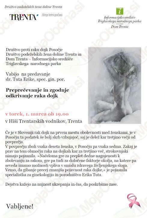 Društvo podeželskih žena doline Trenta in Triglavski narodni park sta v torek, 1. marca 2016, v Hiši Trentarskih vodnikov v Trenti organizirala predavanje z naslovom »Preprečevanje in zgodnje odkrivanje raka dojk« skupaj v sodelovanju z Društvom proti raku dojk Posočje. Predavanje je vodila specialistka ginekologije in porodništva, dr. Erika Tuta. Udeležilo se ga je 24 žensk.