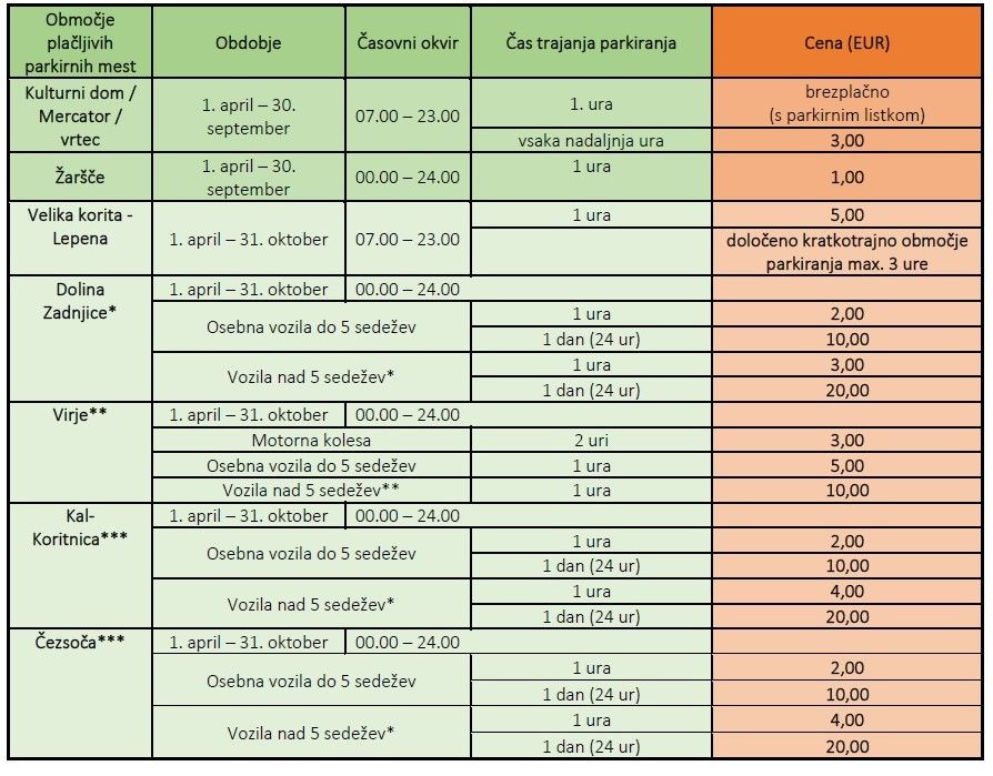 Parkirišče na delih zemljišč s parcelno št. 182/7, 182/9, 182/10, 182/13, 182/15 in 182/16, vse k.o. 2203 Trenta leva, v času od 00.00 do 24.00, na način, da se vsaka ura parkiranja zaračuna v znesku 2,00 EUR za motorna kolesa in osebna vozila do pet sedežev, oziroma 3,00 EUR za vozila nad pet sedežev, pri čemer parkiranje avtobusov, avtodomov, počitniških prikolic ali motornih vozil, ki se uporabljajo za prebivanje, ni dovoljeno. Nadomestilo za 24-urno parkiranje znaša 10,00 EUR/dan za motorna kolesa in osebna vozila do pet sedežev, oziroma 20,00 EUR/dan za vozila nad pet sedežev, pri čemer parkiranje avtobusov, avtodomov, počitniških prikolic ali motornih vozil, ki se uporabljajo za prebivanje, ni dovoljeno.
