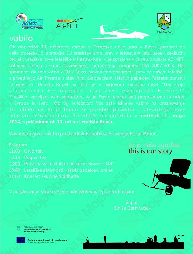Ob obeležitvi 10. obletnice vstopa Republike Slovenije v Evropsko unijo smo v Bovcu ponosni na velik dosežek. S pomočjo EU sredstev smo prav v letošnjem letu uspeli zaključiti gradnjo nove letališke infrastrukture v okviru projekta A3-NET, sofinanciranega s strani Čezmejnega jadranskega programa IPA 2007-2013. Naj spomnimo, da smo vstop v EU v Bovcu slavnostno pospremili prav na našem letališču s prireditvijo Air Theatre, s številnimi akrobacijami letal in padalcev. Takratni zunanji minister dr. Dimitrij Rupel pa nam je v nagovoru zanosno dejal: "Naj živijo slovenski Evropejci, naj živi evropski Bovec!"