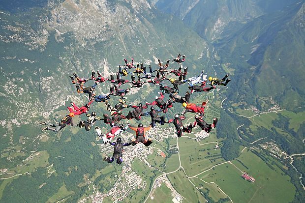 Že osmi kamp AvioFun podira rekorde. Toliko padalcev, kot jih je tokrat prišlo v Bovec, še niso zabeležili, v ponedeljek pa so v drugem poskusu postavili še en presežek: 35 padalcev je sočasno skočilo in s tem so v zraku sestavili največjo formacijo na slovenskem nebu doslej. Dogajanje bo pestro tudi še naprej, predvsem v soboto, ko napovedujejo atraktivne skoke nežnejšega spola v kopalkah.