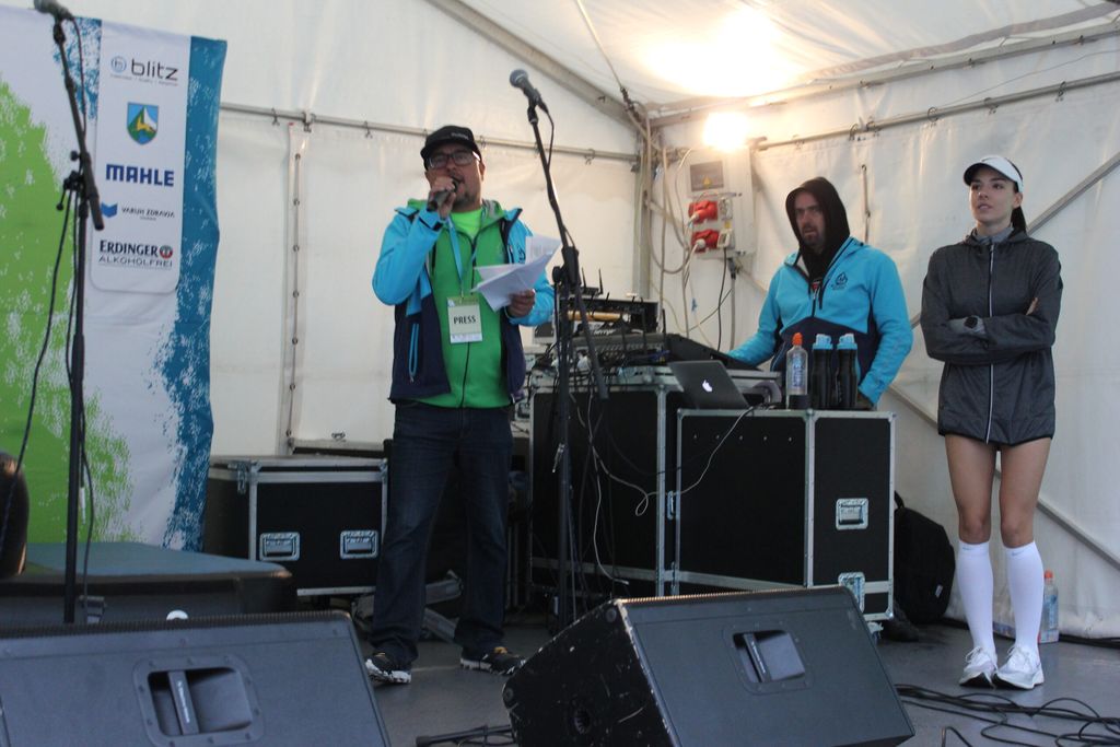 Tudi po ogrevanju tekačev, nekaj minut pred deveto uro na bovškem trgu pozdravil letošnji dogodek in vse prisotne in vsem zaželel prisrčno dobrodošlico na Bovškem: