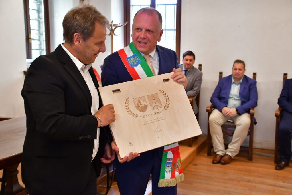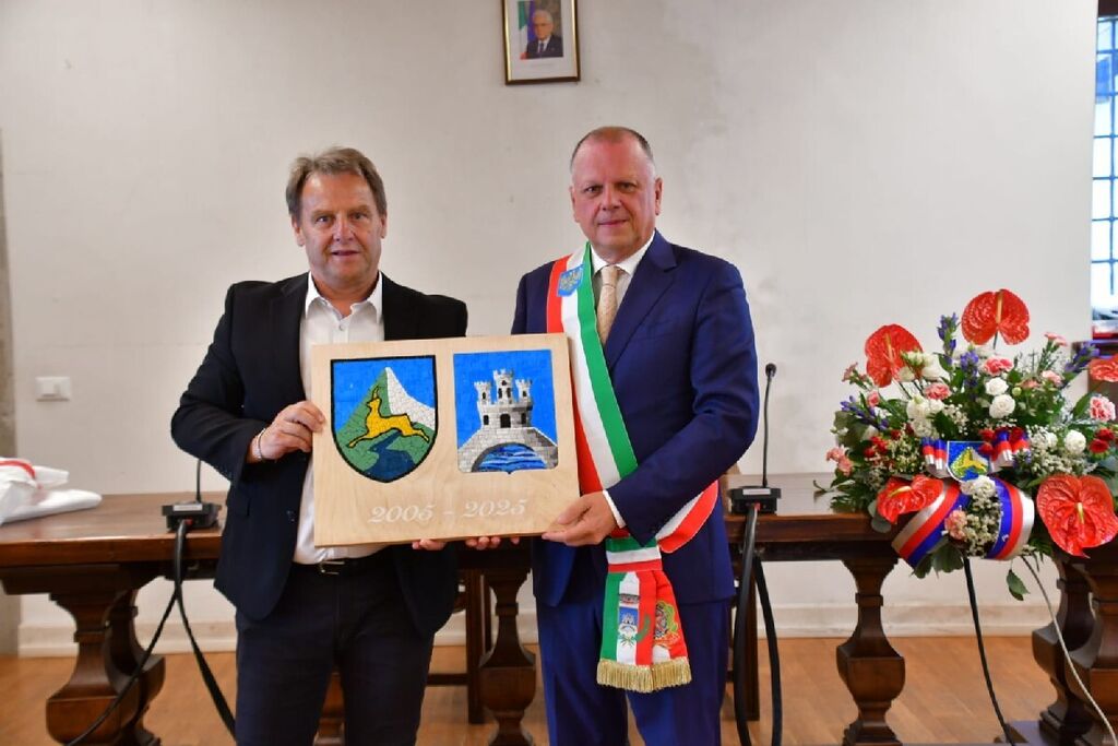Oba župana sta v svojih nagovorih izpostavila pomembnost osebnih stikov tako med administracijami kot med prebivalci, oba pa tudi ugotavljala, da je institucionalno sodelovanje preraslo v pravo prijateljstvo. Vse je pozdravil tudi nekdanji župan Občine Čenta Lucio Tollis, ki je bil leta 2005 s takratnim županom Občine Bovec Danilom Krivcem podpisnik listine o pobratenju. Sledila je predaja daril, župan Občine Čenta Mauro Steccati pa je bovškemu županu Valterju Mlekužu predal ploščo z grboma obeh občin in posvetilom: župani in administracije se menjajo, obojestranske vezi in zaveze pa ostajajo trdne in neomajne.