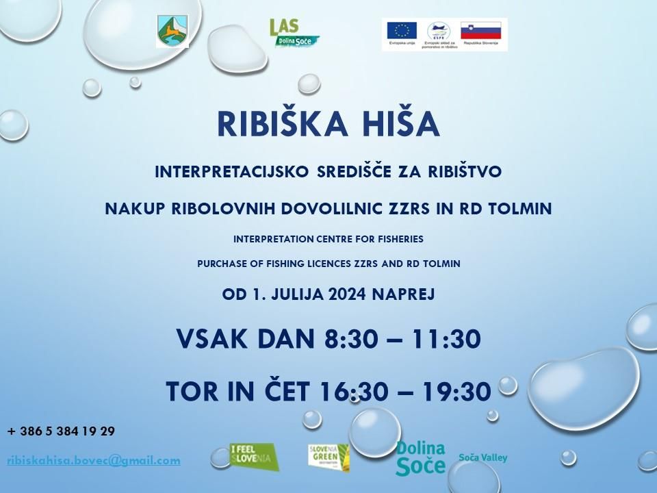 Sporočamo vam, da bo od 1. julija 2024 naprej Ribiška hiša – interpretacijsko središča na Kalu Koritnici odprta po novem urniku, in sicer vsak dan 8:30 – 11:30, ob torkih in četrtkih pa od 16:30 – 19:30. Možen je tudi NAKUP RIBOLOVNIH DOVOLILNIC ZZRS in RD TOLMIN.