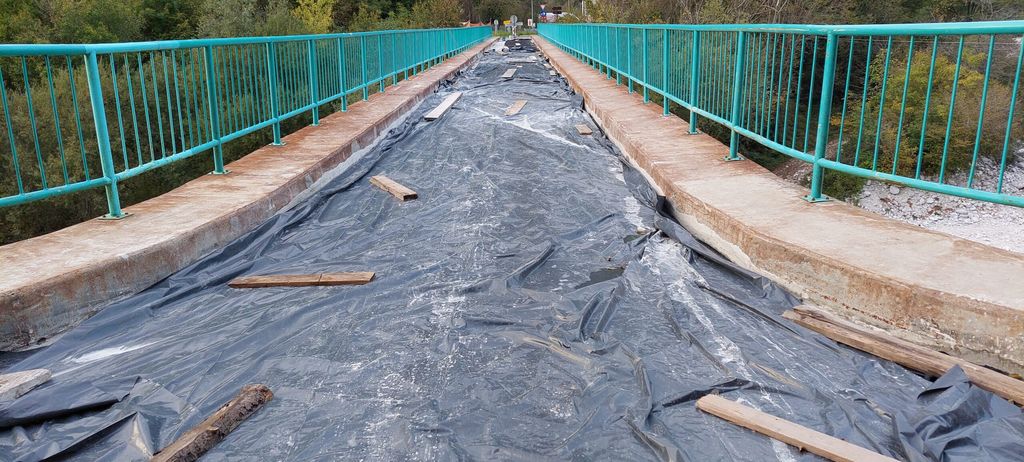 Na mostu v Log Čezsoški je izvajalec del Saning d.o.o. že vgradil armiranobetonsko ploščo, zdaj pa se mora ta pred izvedbo hidroizolacije oziroma preplastitvijo z asfaltno prevleko dobro posušiti.
