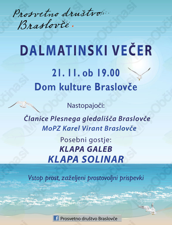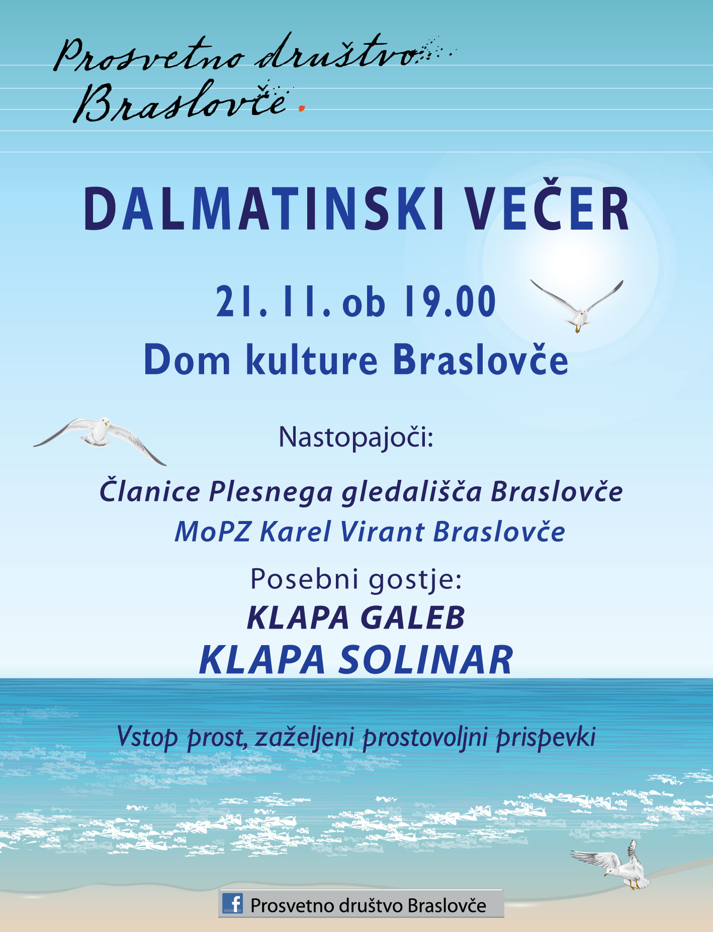 Prosvetno društvo Braslovče vabi v Dom kulture Braslovče na DALMATINSKI VEČER. Z dalmatinskim repertoarjem vas bodo navdušili člani MoPZ Karel Virant Braslovče, prvič se bodo domačemu občinstvu predstavili člani Klape Galeb in plesalke novoustanovljenega Plesnega gledališča, ki deluje pod okriljem Prosvetnega društva Braslovče pod mentorskim vodstvom Ane Vovk Pezdir.