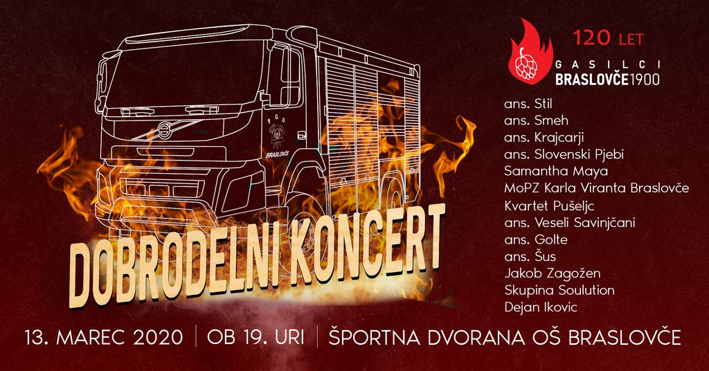 Prostovoljno gasilsko društvo Braslovče v petek, 13. marca 2020, ob 19:00 uri v Športni dvorani OŠ Braslovče organizira DOBRODELNI KONCERT ZA NAKUP NOVEGA GASILSKEGA VOZILA. Na koncertu bodo nastopili ansambli Stil, Smeh, Golte, Krajcarji, Slovenski pjebi, Veseli Savinjčani, Šus, kvartet Pušeljc in Soulution, pevca Samantha Maya in Jakob Zagožen ter Moški pevski zbor Karla Viranta Braslovče. Koncert bo povezoval Dejan Ikovic. Vstopnice so na voljo na prodajnih mestih: Pošta in TIC Braslovče, bistro Nova kobula, bistro BB Braslovče, bistro Grešni kozel Male Braslovče in TIC Mozirje ali pri članih društva. Informacije o koncertu najdete na spletni strani braslovce-gasilci.si ali Facebook strani (PGD Braslovče).