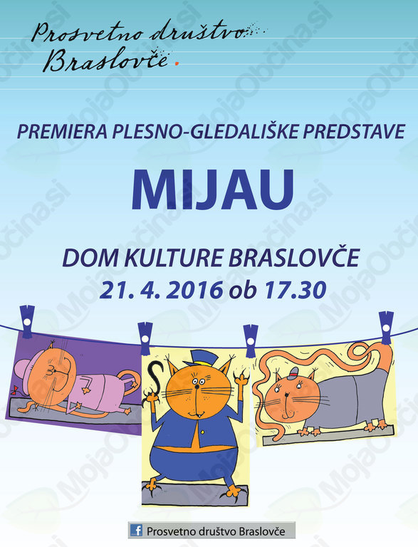 Prosvetno društvo Braslovče vabi v četrtek, 21. 4. 2016, ob 17.30, na prvo premiero plesno-gledališkega dogodka Mijau, v katerem nastopajo članice in člani Plesnega gledališča Braslovče, ki delujejo pod strokovnim vodstvom priznane slovenske plesne pedagoginje in koreografinje, Ane Vovk Pezdir.