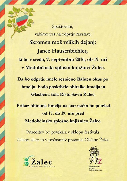 vabimo vas na odprtje razstave Skromen mož velikih dejanj: Janez Hausenbichler, ki bo v sredo, 7. septembra 2016, ob 19. uri v Medobčinski splošni knjižnici Žalec.