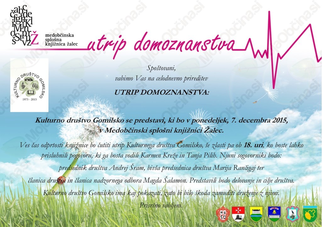 Vabimo vas na celodnevno prireditev Utrip domoznanstva: Kulturno društvo Gomilsko se predstavi, ki bo v ponedeljek, 7. decembra 2015, ob 18. uri v Medobčinski splošni knjižnici Žalec.