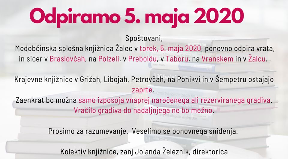 Medobčinska splošna knjižnica Žalec v torek, 5. maja 2020, ponovno odpira vrata, in sicer v Braslovčah, na Polzeli, v Preboldu, v Taboru, na Vranskem in v Žalcu. Krajevne knjižnice v Grižah, Libojah, Petrovčah, na Ponikvi in v Šempetru ostajajo zaprte. Zaenkrat bo možna samo izposoja vnaprej naročenega ali rezerviranega gradiva.