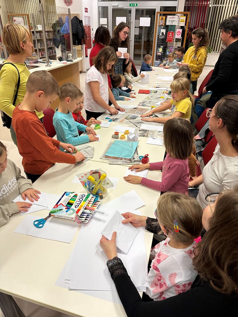 Tudi mi smo si želeli veselja, ki ti ga prinese dober klobuk, zato smo se skupaj z otroki in njihovimi starši preizkusili v zgibanju papirnatega klobuka. Bili smo uspešni, in to tako zelo, da nam je ostal še čas za okrasitev klobukov. Dogovorili smo se, da lahko vsak svoj klobuk doma poklonijo svojim plišastim medvedkom, dinozavrom, muckam … Bilo je lepo in se že veselimo decembrskega pravljičnega druženja.