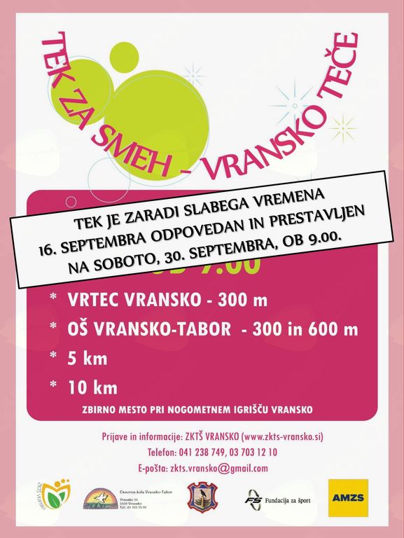 "TEK ZA SMEH-VRANSKO TEČE" JE ZARADI SLABEGA VREMENA 16. SEPTEMBRA ODPOVEDAN IN PRESTAVLJEN NA SOBOTO, 30. SEPTEMBRA, OB 9.00.