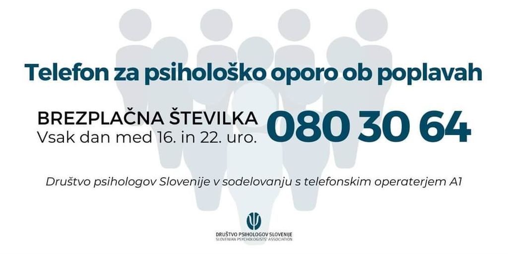 - Društvo psihologov Slovenije. Telefon za psihološko oporo ob poplavah: 080 30 64 (vse dni v tednu med 16. in 22. uro). Klic je brezplačen. *Telefon bo deloval od 12. 8. 2023 dalje.