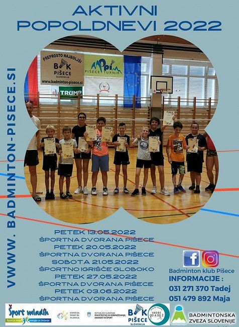 Organizatorji sporočajo: ''Še predno se bodo začele počitnice bomo v športni dvorani OŠ Maksa Pleteršnika Pišece izvedli štiri aktivne petkove popoldneve. Za začetnike smo pripravili krajši začetniški tečaj badmintona medtem ko bomo za redno vadeče badmintoniste pripravili prav posebne aktivne ure.''