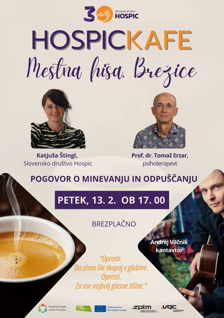 Vabljeni na Hospickafe, pogovorni večer, namenjen vsem, ki se srečujejo s staranjem, boleznijo, izgubo ali notranjimi slovesi. Dogodek odpira varen prostor za razmislek o tem, kako v procesu poslavljanja najti odpuščanje – za vse, kar je bilo, kar ni bilo izrečeno in kar postopoma odhaja. Hospickafe je namenjen vsem, ki bi radi preživeli nežen večer v iskrenem pogovoru, prijetni glasbi in skodelici kave. Z nami bosta: Katjuša Štingl iz Slovenskega društva Hospic in prof. dr. Tomaž Erzar, psihoterapevt. Večer bo obogatil kantavtor Andrej Vilčnik, ki bo zapel svoje avtorske pesmi.