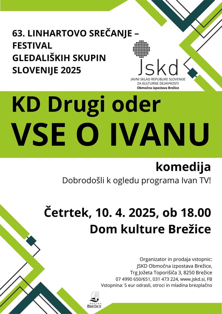 Kulturno društvo Drugi oder vas prisrčno vabi na zabavno gledališko predstavo Vse o Ivanu, ki bo v četrtek, 10. aprila 2025, ob 18.00 v Domu kulture Brežice.