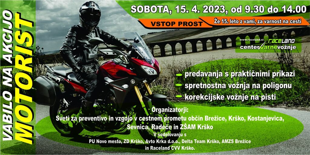 V soboto, 15. 4. 2023, bo od 9.30 do 14.00 v Centru varne vožnje Raceland potekala vsakoletna akcija Motorist: predavanja s praktičnimi prikazi, spretnostna vožnja na poligonu in korekcijske vožnje na pisti.