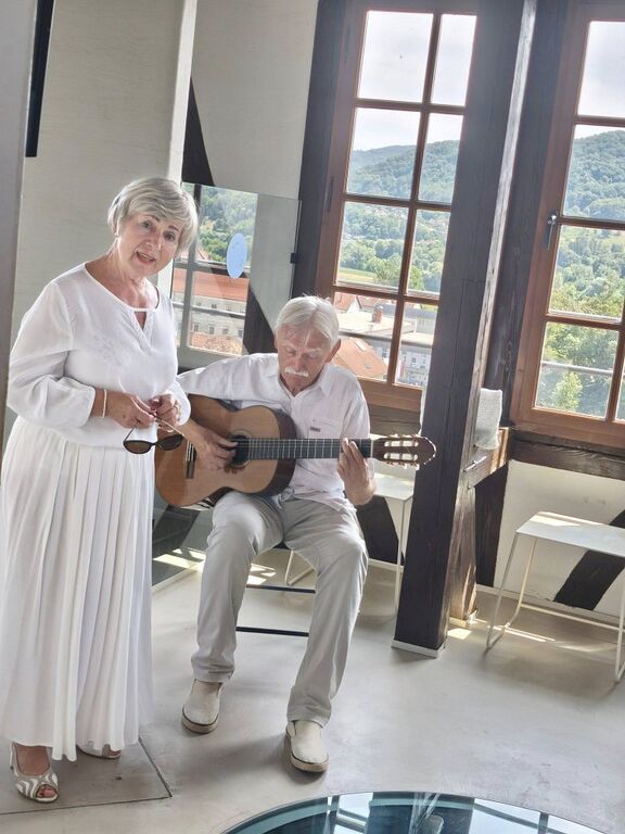 Gostje so si ogledali Posavski muzej Brežice in Vodovodni stolp, kjer sta za glasbeno presenečenje poskrbela Elizabeta in Dragutin Križanić.