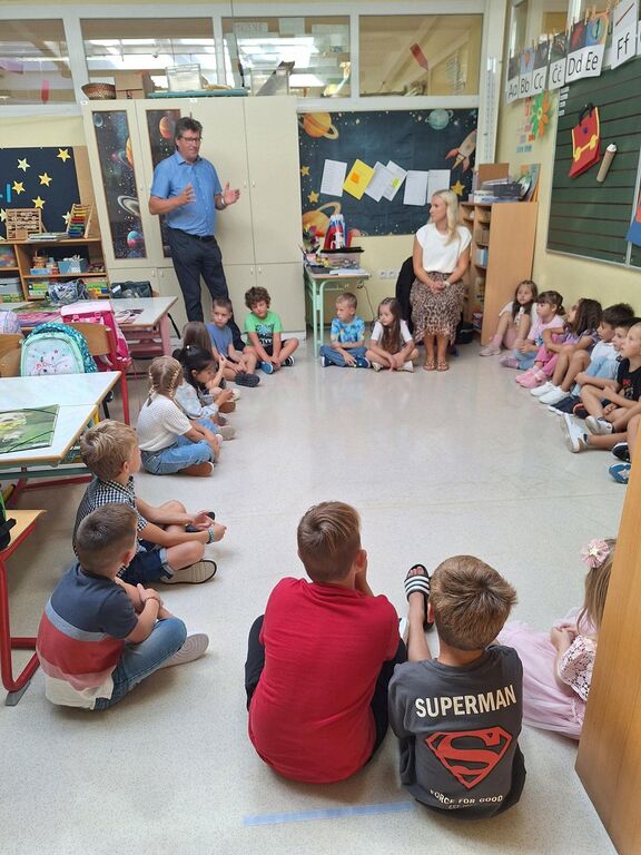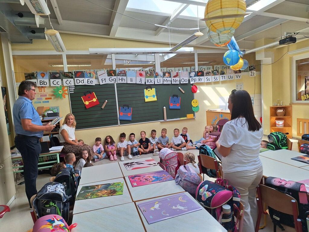 Župan je sodeloval pri uvodnem delu prvega šolskega dneva v 1. C razredu, ki ga obiskuje 24 učenk in učencev. Povedali so mu, da se v razredu dobro počutijo, župan pa jim je podaril knjige in slikanice za razredno knjižnico.