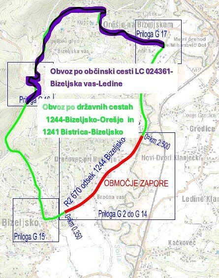 Obvoz bo potekal v smeri R1 219 odsek 1241 Bistrica-Bizeljsko, LC 024361-Bizeljska vas-Ledine, R3 670 odsek 1244 Bizeljsko-Orešje in obratno.