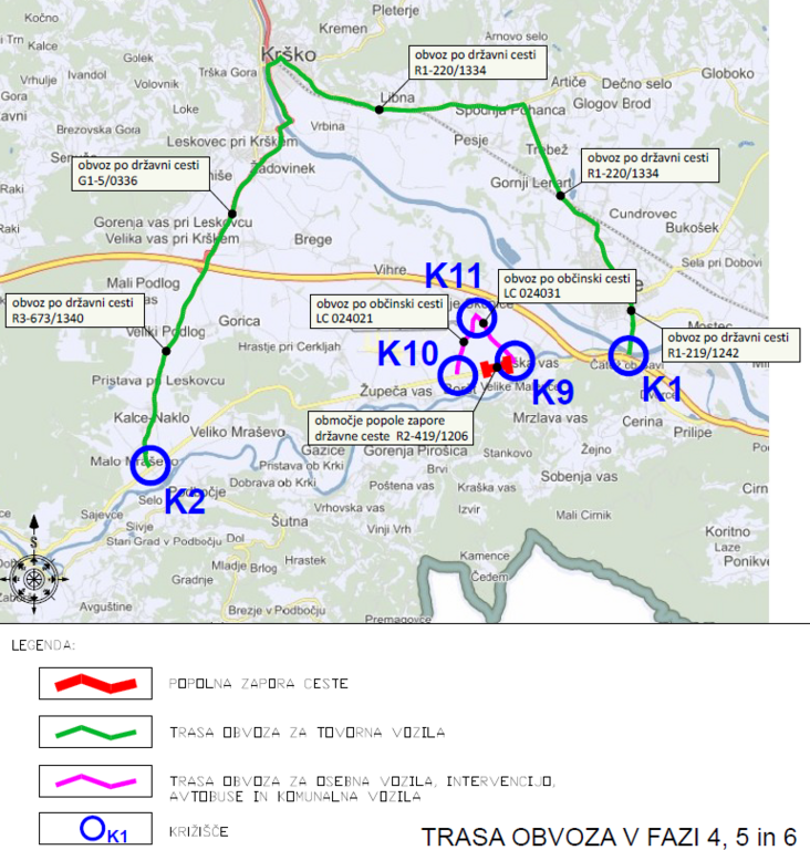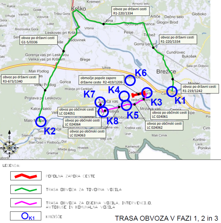 -LC 024031 Krška vas–Dolenje Skopice (od km 0,000 do km 1,646), obvoz je dovoljen le pod pogojem predhodnega usklajevanja z izvajalcem (Kostak d.d.) skladno z Dovoljenjem o delni ali popolni zapori ceste št. 371-157/2024 z dne 12. 12. 2024, ki ga je izdala Občina Brežice, OKIGJS, Cesta prvih borcev 18, 8250 Brežice. Na tej lokalni cesti je namreč v veljavi zapora do 31. 1. 2026.