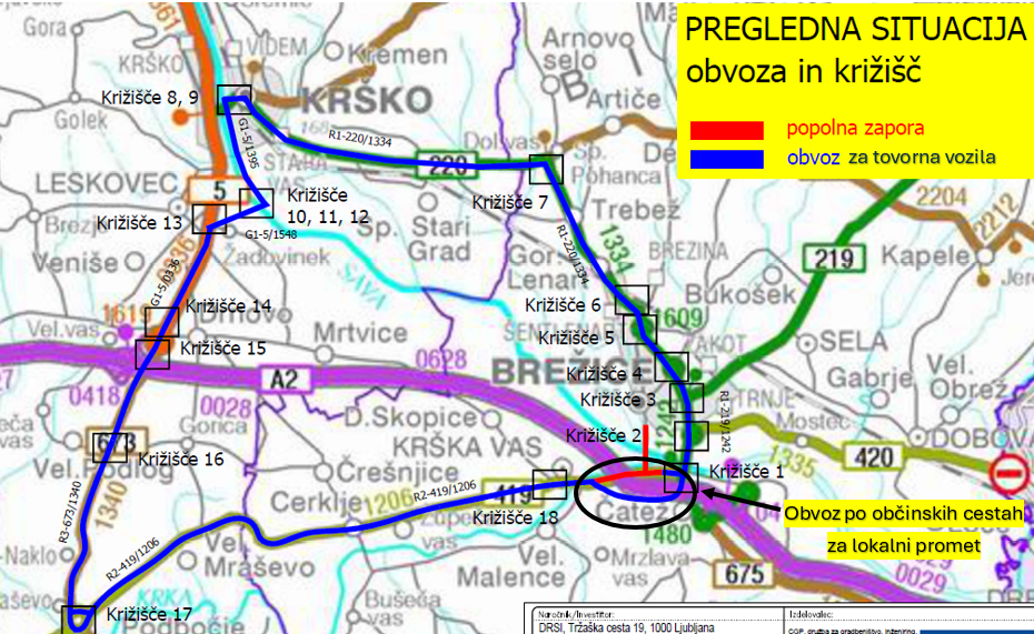 Zaradi izvajanja del čiščenja in obsekovanja brežin nad državno cesto bo uvedena popolna zapora državne ceste na odseku od Krške vasi do Čateža ob Savi, v skupni dolžini 1.350 metrov