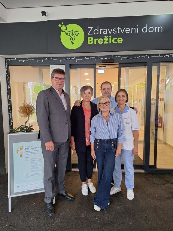 Od leve proti desni: župan Ivan Molan, koordinatorka Zveze organizacij pacientov Slovenije Metka Kržan, direktor Zdravstvenega doma Brežice Dražen Levojević, pevka Nuša Derenda in pomočnica direktorja za področje zdravstvene nege Helena Hostar